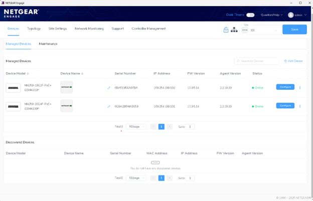 At this point, both network switches will receive a temporary IP address provided by the DHCP server, and both switches will show up under the ‘Managed Devices’section.